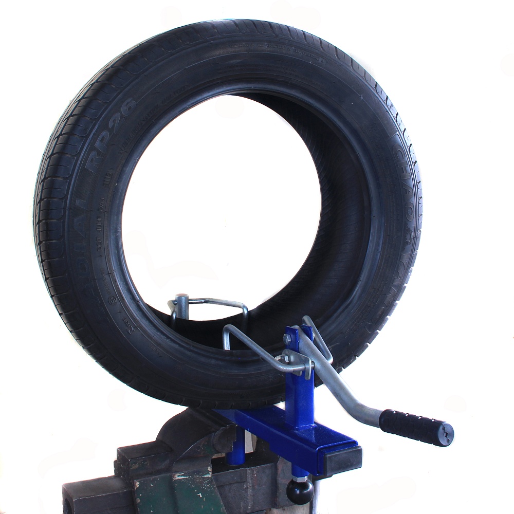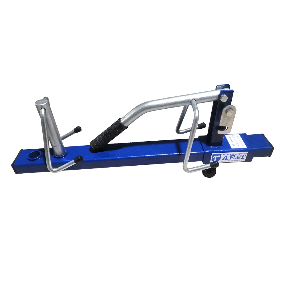 Прибор имеет простую конструкцию: это опорная планка с крюками-зажимами, которые устанавливаются на борта шины, а затем разводятся в стороны нажатием на рычаг. Один зажим может перемещаться по планке, позволяя устанавливать покрышки различной ширины, и закрепляется винтом.