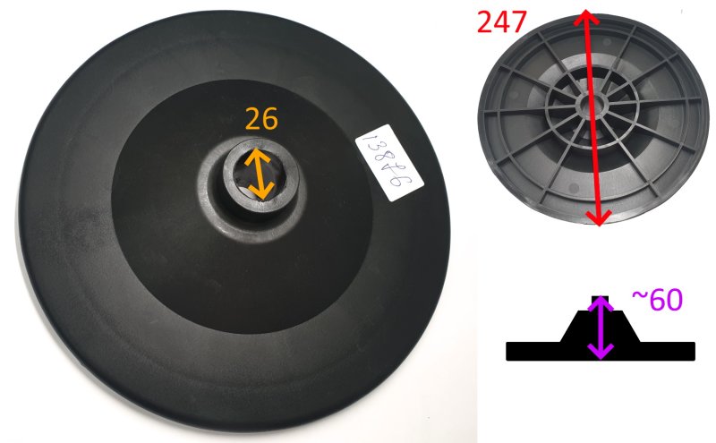 Отжимной ролик (диск) используется в составе вспомогательного устройства (третья рука). Выполняет функции отжима покрышки от диска, и съема покрышки с диска. Диаметр: 247мм. Посадочное отверстие: 26мм.