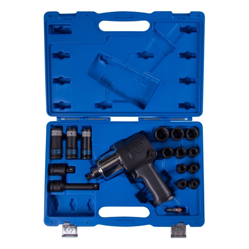 Гайковерт профессиональный пневматический ударный 1/2", максимальный крутящий момент 1500 Нм., скорость вращения 8000 об/мин., расход воздуха 200 л/мин. В комплекте 8 ударных головок и удлинитель.