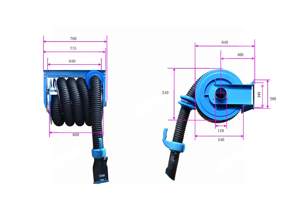 Катушка со шлангом для удаления выхлопных газов (шланг 10,0м. х Ø127 мм)   Механическая пружина возврата шланга. Комплект поставки: шланг из термостойкого армированного эластомера (TPE)., резиновое газоприемное сопло с рукояткой, стопор, салазки для крепления.