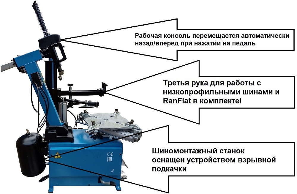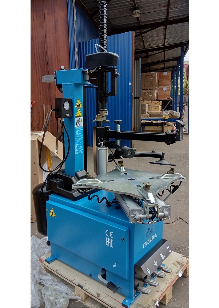 Комплект из автоматического шиномонтажного стенда TS-3226А. Предназначен для монтажа и демонтажа шин легковых автомобилей, внедорожников и легких грузовиков с размером колес от 11-24 дюйма. Усилие пневмоцилиндра в 2500 кг. В комплекте: полноценная 3-й рука для работы с жесткой и низкопрофильной резиной RUNFLAT. + встроенный бустер  24 литра (взрывная подкачка) + пистолет для подкачки шин + монтажка + регулятор давления с влагоотделителем и манометром.
