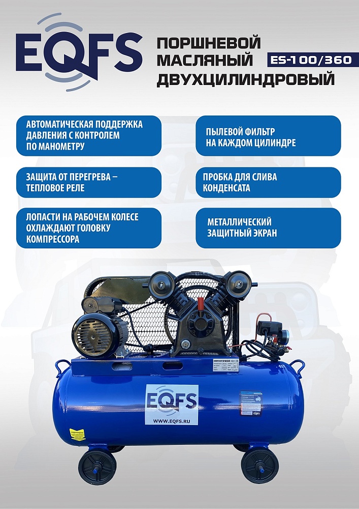Компрессор воздушный, передвижной, поршневой, масляный, двухцилиндровый. Быстро достигает нужного давления. Двухпоршневая головка двигателя уменьшает износ деталей и увеличивает срок службы. Ремённый привод — предохранят мотор от поломки. Идеальное решение для небольшой мастерской, шиномонтажа, гаража или дачи. Давление 8 Атм. Производительность 360 л/мин. Мощность 2.2 кВт. Напряжение 220В. Ёмкость ресивера 100 л. Гарантия 12 месяцев.