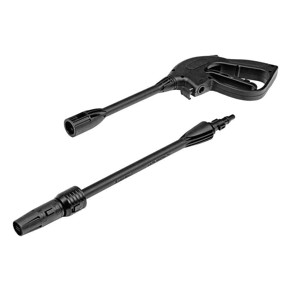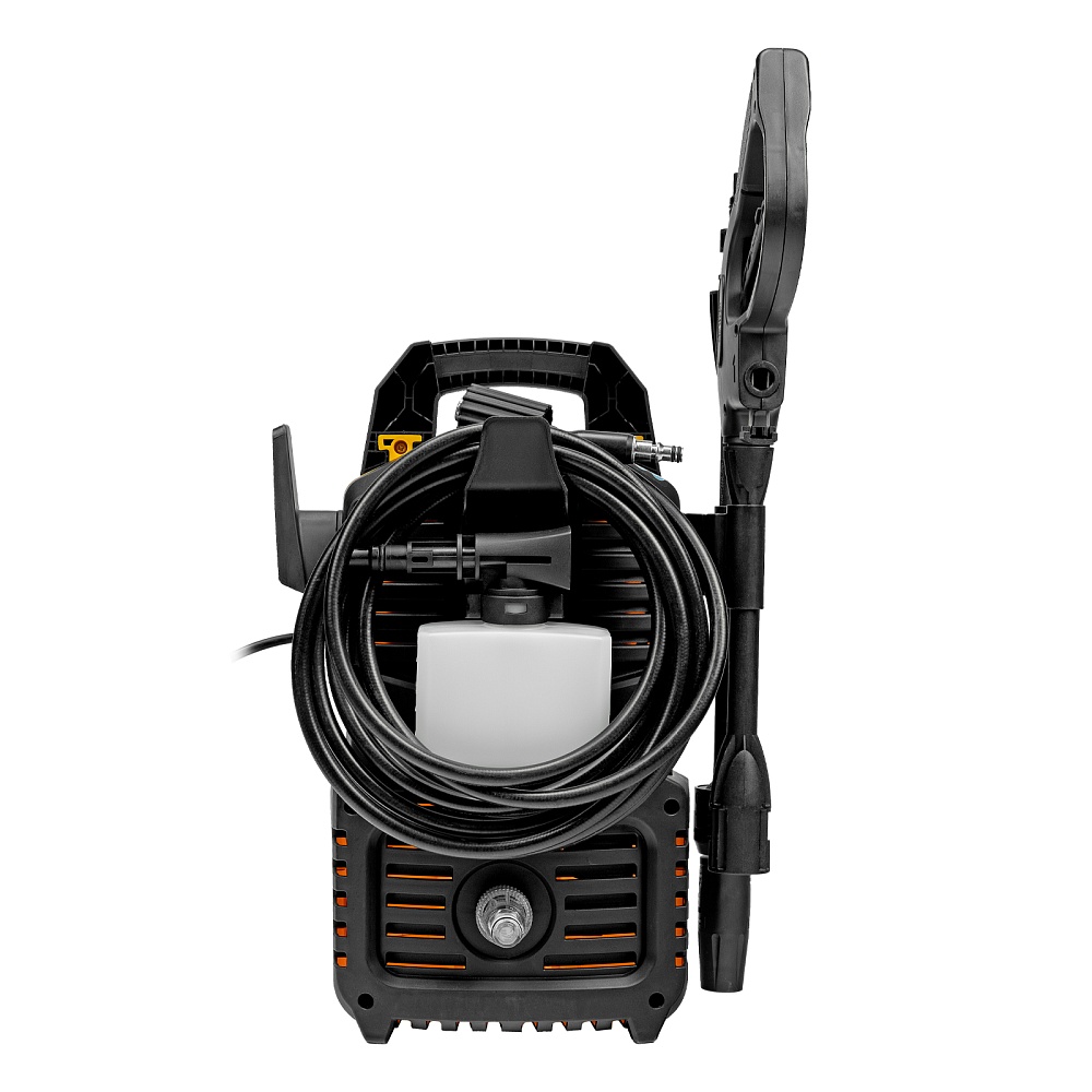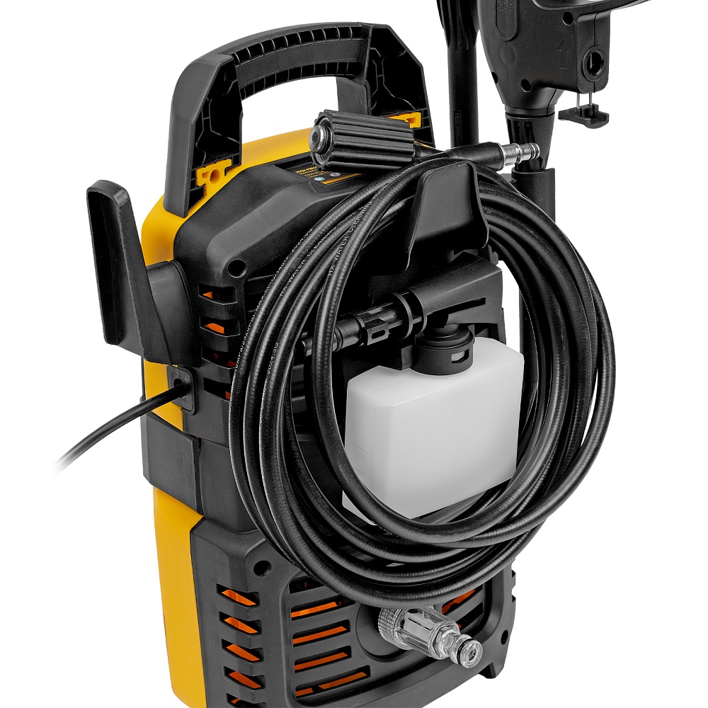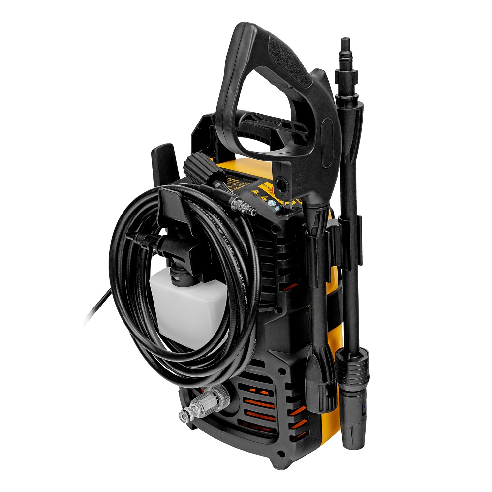 Мойка высокого давления, Шланг высокого давления, Пистолет моечный, Насадка-удлинитель пистолета, Регулируемая насадка-сопло, Пеногенератор с бачком для моющего средства, Входной штуцер с фильтром, Быстросъемный коннектор шланга, Игла для прочистки сопла, Кронштейн-держатель пистолета, Кронштейн для кабеля питания, Комплект крепежа, Инструкция по эксплуатации с гарантийным талоном