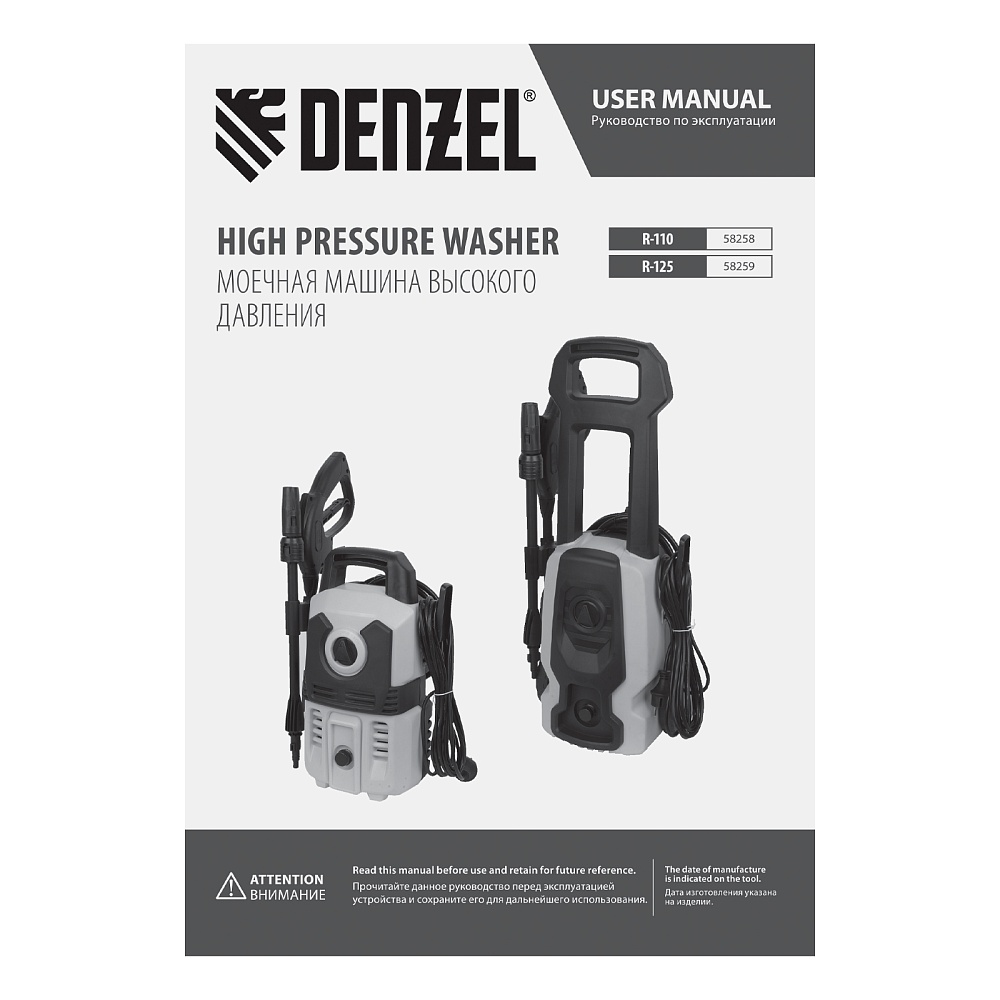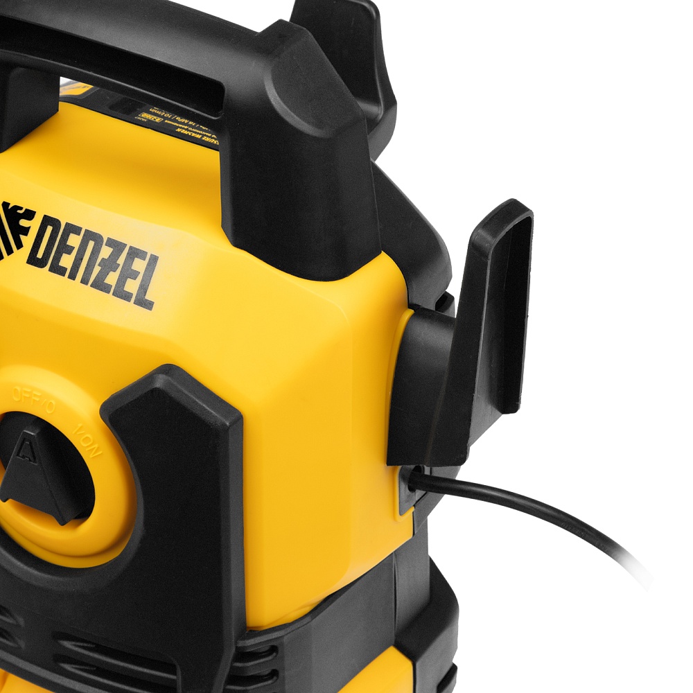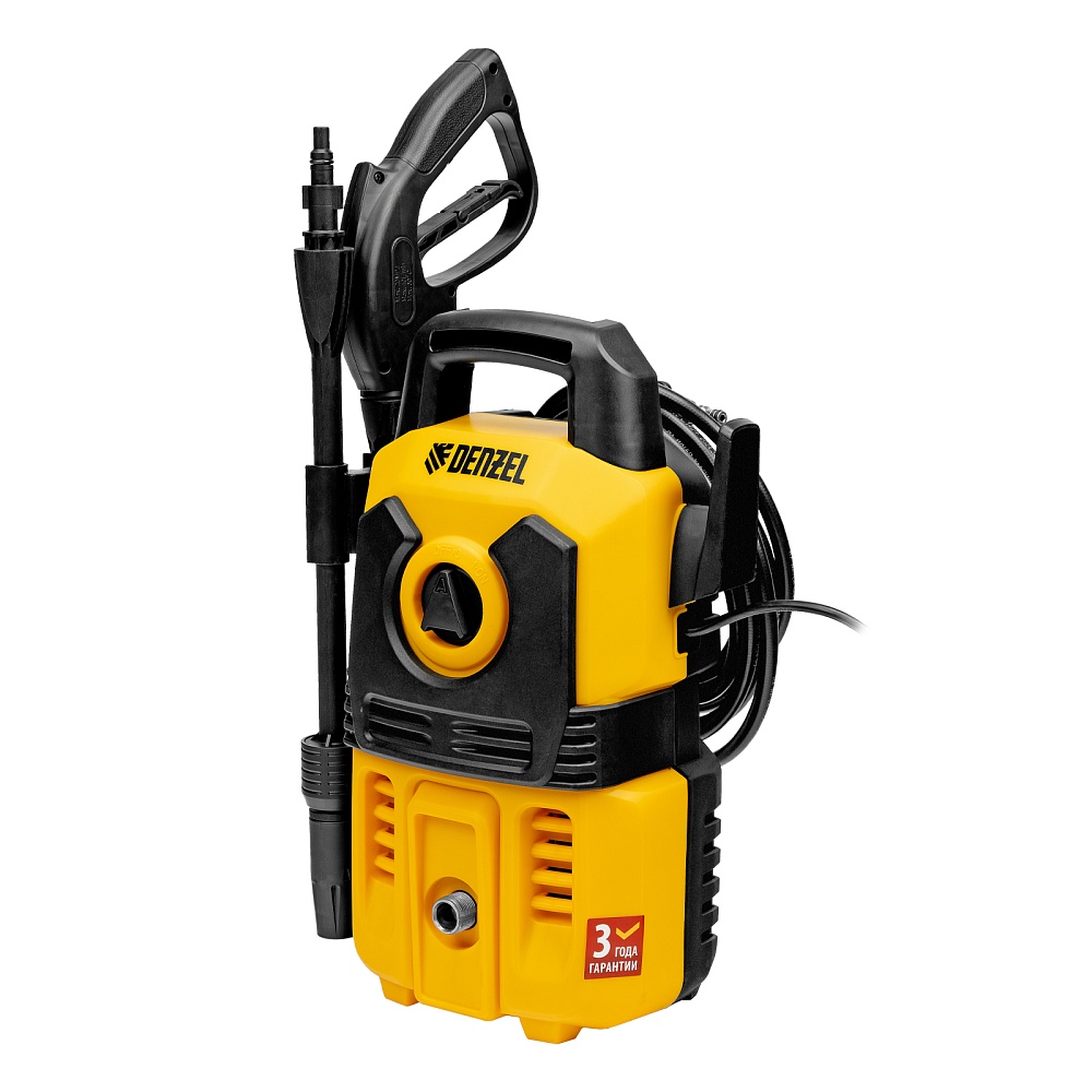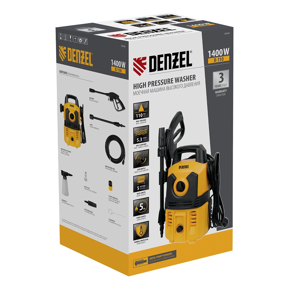 <p>Моечная машина высокого давления Denzel R-110 58258 мощностью 1400 Вт предназначена для мытья различных поверхностей при помощи водяной струи под давлением. Максимальное давление составляет 110 бар, производительность — 320 л/ч. С помощью мойки можно быстро и эффективно очистить фасад дома, дорожки на дачном участке, кузов автомобиля, садовую мебель и инвентарь. Машина подключается к водопроводной сети, а в случае ее отсутствия может забирать воду из любого открытого резервуара, работая в режиме самовсасывания. Рекомендована для использования в быту.</p><h2>Преимущества</h2><ul><li>Надежность — помпа с металлическими плунжерами выдерживает высокие нагрузки и обеспечивает стабильную работу в течение длительного времени.</li><li>Удаление въевшихся загрязнений — при необходимости можно использовать моющие средства, для этого предусмотрен внешний бачок с насадкой пеногенератора.</li><li>Эффективность — регулируемая насадка-сопло позволяет настраивать тип и интенсивность распыления в соответствии с поставленной задачей.</li><li>Простая подготовка к работе — благодаря быстросъемному адаптеру подключение входного шланга не занимает много времени.</li><li>Защита от засорения — фильтр входного штуцера задерживает посторонние частицы.</li><li>Безопасность — токопроводящие элементы надежно изолированы, внутренние части машины защищены от попадания воды по стандарту IPX5.</li><li>Защита от случайного пуска — перед началом работы необходимо разблокировать рычаг моечного пистолета.</li><li>Защита от превышения допустимого давления — манометрический выключатель останавливает насос при отпущенном рычаге пистолета.</li><li>Термозащита — производитель предусмотрел датчик температуры, электродвигатель автоматически отключается при перегреве.</li><li>Комфортное передвижение — длина кабеля и шланга высокого давления составляет 5 м.</li><li>Мобильность и компактность — благодаря рукоятке и легкому весу машина легко перемещать и транспортировать, а также она не занимает много места в зоне хранения.</li><li>Несложный уход — в комплект поставки входит игла для прочистки сопла.</li><li>Продуманная конструкция — кронштейны для шнура питания и шланга высокого давления, а также держатель для пистолета обеспечивают удобство хранения.</li><li>Гарантия 3 года — надежность мойки высокого давления подтверждена производителем.</li></ul>
