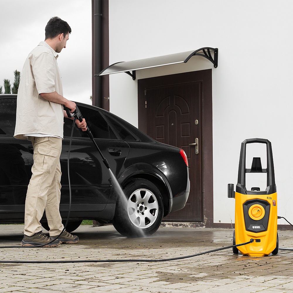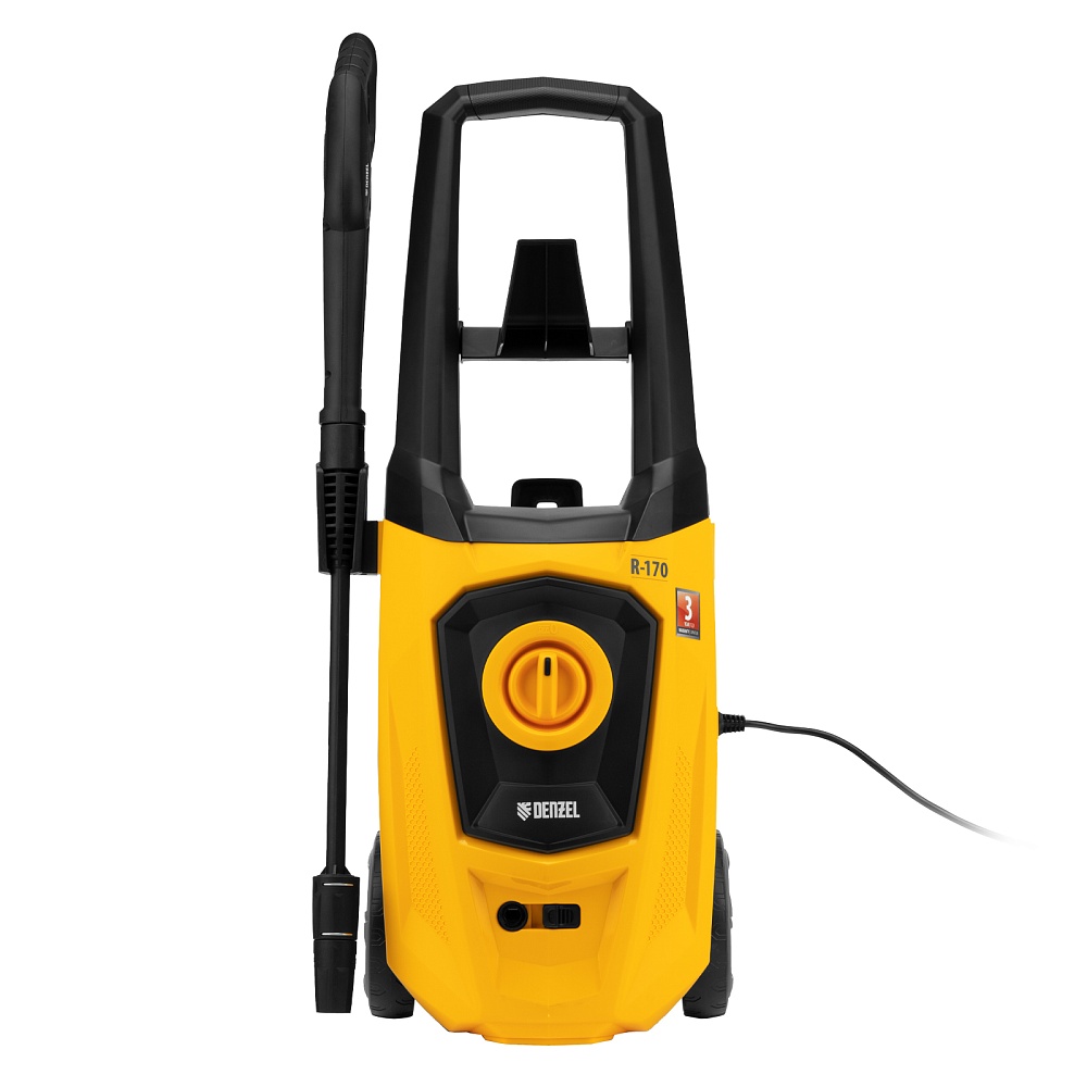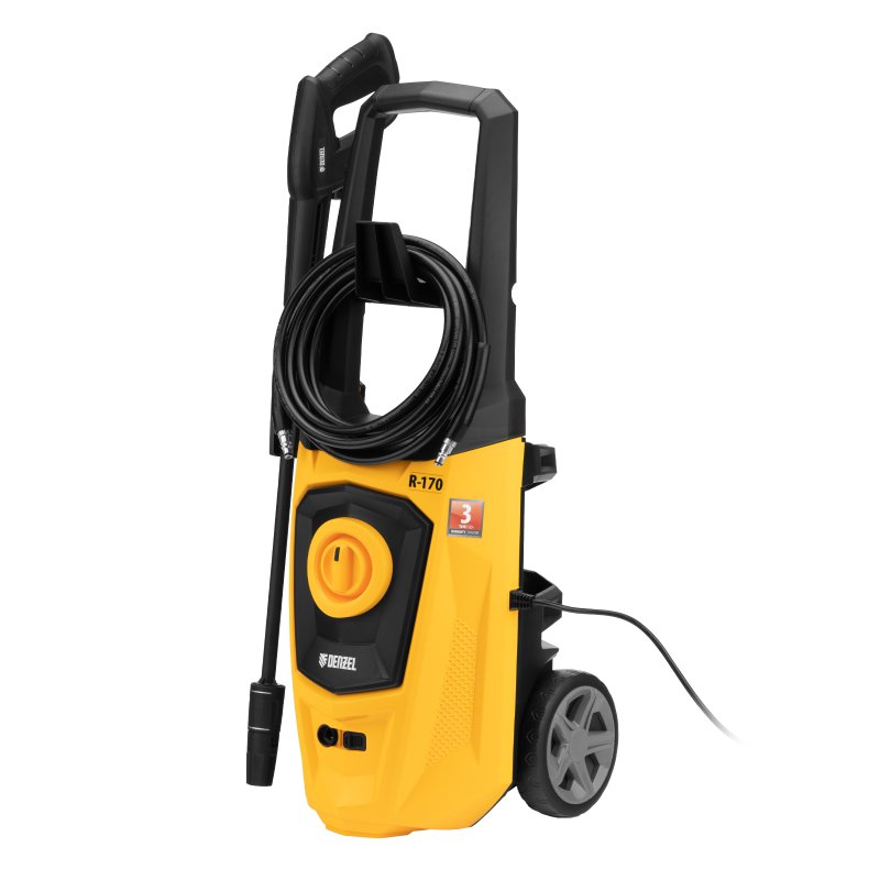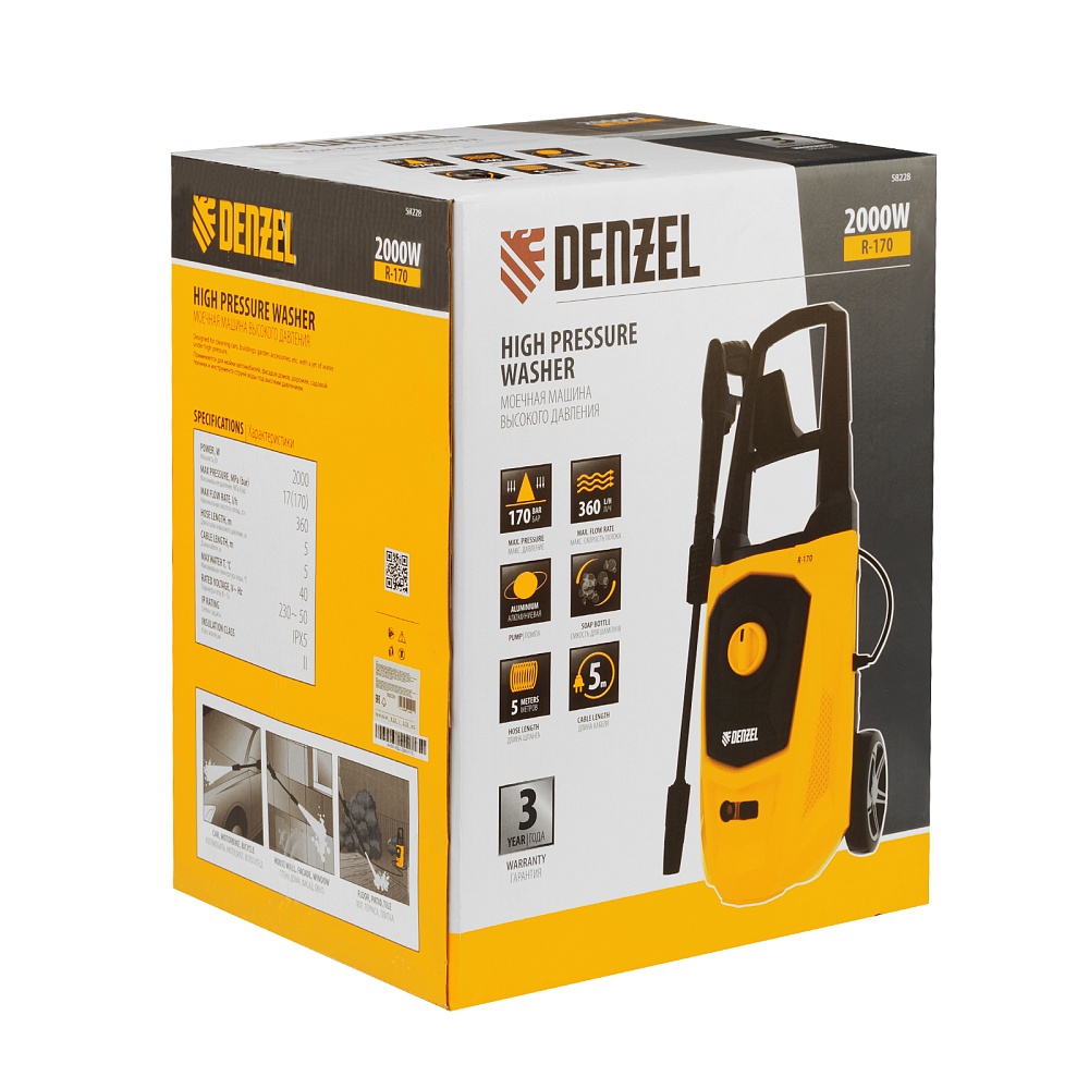 <p>Колесная моечная машина высокого давления Denzel R-170 58228 мощностью 2000 Вт и производительностью 360 л/ч подает струю воды под давлением 170 бар и используется для очищения поверхностей. Позволяет быстро удалить загрязнения с кузова автомобиля, мотоцикла, велосипеда, садового и хозяйственного инвентаря, очистить садовую дорожку и террасу, а также стены и окна строений. Источником воды может служить водопроводная линия, а также любая емкость — машина способна работать в режиме самовсасывания. Мойка пригодится владельцам загородных участков.</p><h2>Преимущества</h2><ul><li>Надежность — двигатель с медной обмоткой обеспечивает стабильную работу моечной машины даже при высоких нагрузках.</li><li>Защита от перегрева — термозащита отключает двигатель в случае перегрузки, предохраняя его от поломки.</li><li>Высокий ресурс — алюминиевая помпа рассчитана на интенсивное использование.</li><li>Экологичность — машина работает без вредных выхлопов и неприятных запахов.</li><li>Система фильтрации — вода поступает без посторонних примесей, что увеличивает срок службы машины.</li><li>Класс защиты II — двойная изоляция токопроводящих элементов надежно защищает пользователя от поражения электрическим током.</li><li>Установка оптимального вида распыления — насадка-удлинитель оснащена регулируемым соплом.</li><li>Блокировка рычага пистолета — защита от случайного запуска обеспечивает безопасность пользователя.</li><li>Комфортная работа в труднодоступных местах — насадка-удлинитель позволяет очистить самые удаленные уголки.</li><li>Эффективная работа — можно использовать моющее средство, для которого предусмотрен встроенный бачок.</li><li>Простое подключение — быстросъемный адаптер позволяет легко присоединить входной шланг.</li><li>Длина шланга и кабеля 5 м — не нужно часто перемещать машину, можно работать на удалении от розетки.</li><li>Несложный уход — в комплект поставки входит игла для прочистки сопла.</li><li>Мобильность — мойка оснащена колесами и ручкой для удобного перемещения. </li><li>Гарантия 3 года — высокое качество машины подтверждена производителем.</li></ul>