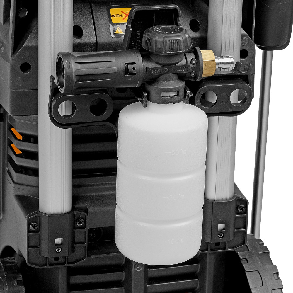 Мойка высокого давления, Барабан для шланга (установлен), Шланг высокого давления (установлен), Пистолет, Удлинитель пистолета, Сменные сопла 3 шт, Пеногенератор с бачком для моющего средства, Входной штуцер с фильтром, Быстросъемный коннектор шланга, кронштейн-держатель пистолета, Кронштей сетевого кабеля, Игла для прочистки сопла, Комплект крепежа, Инструкция с гарантийным талоном