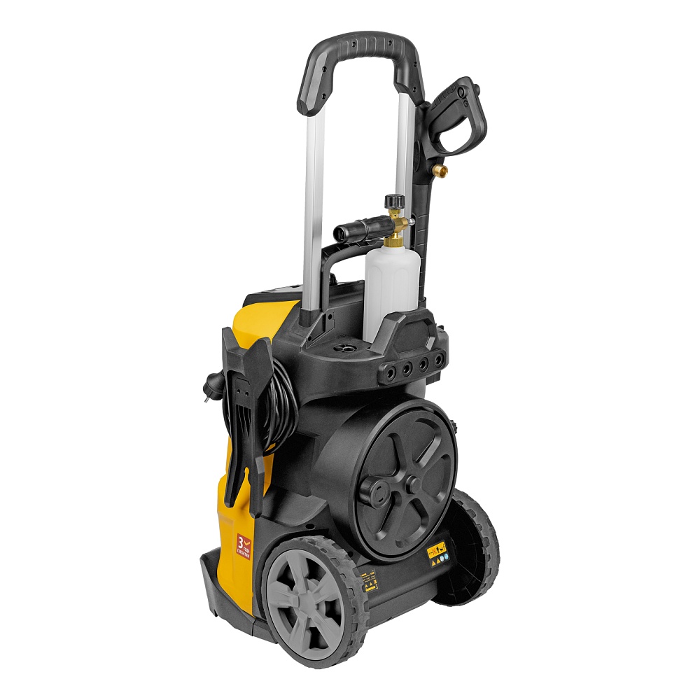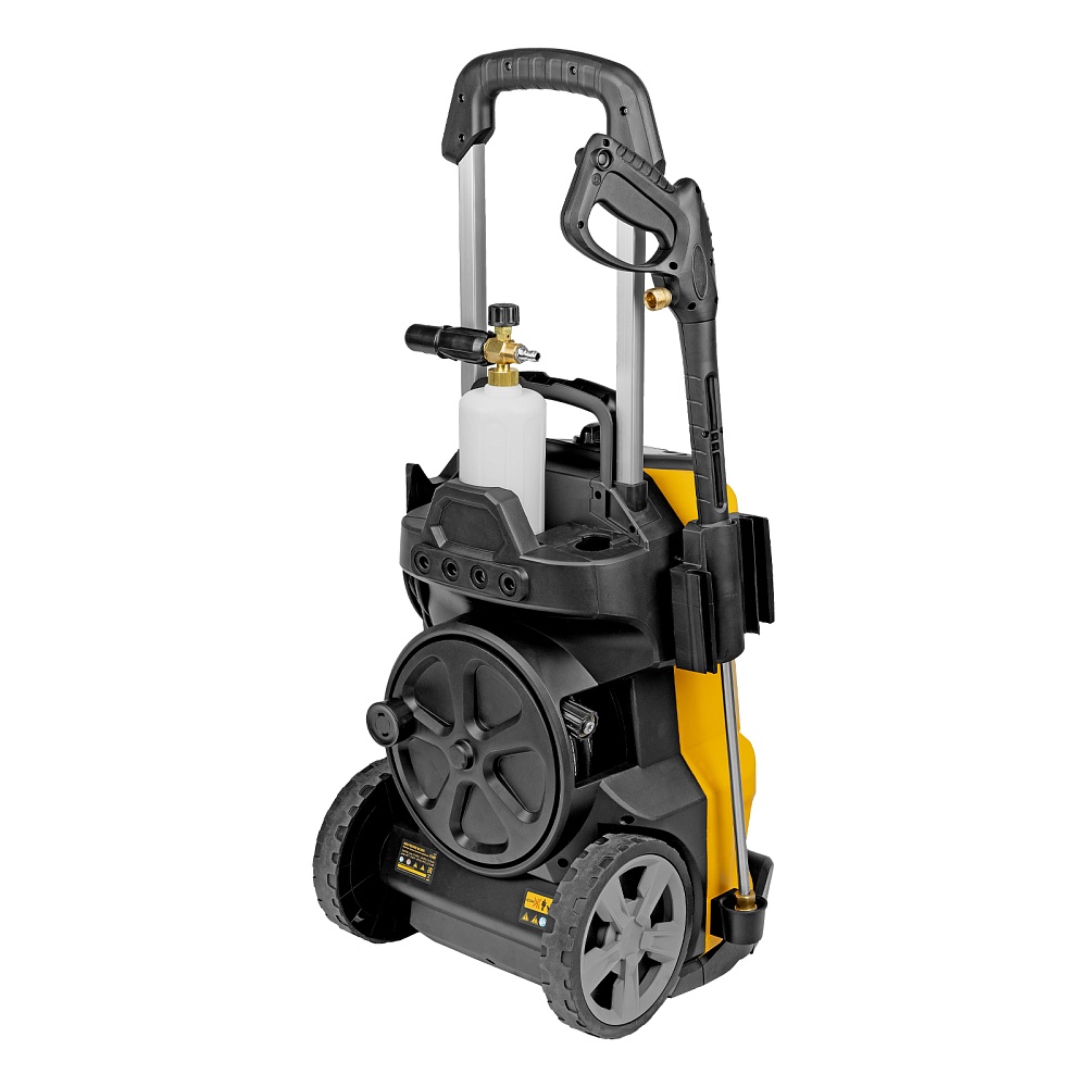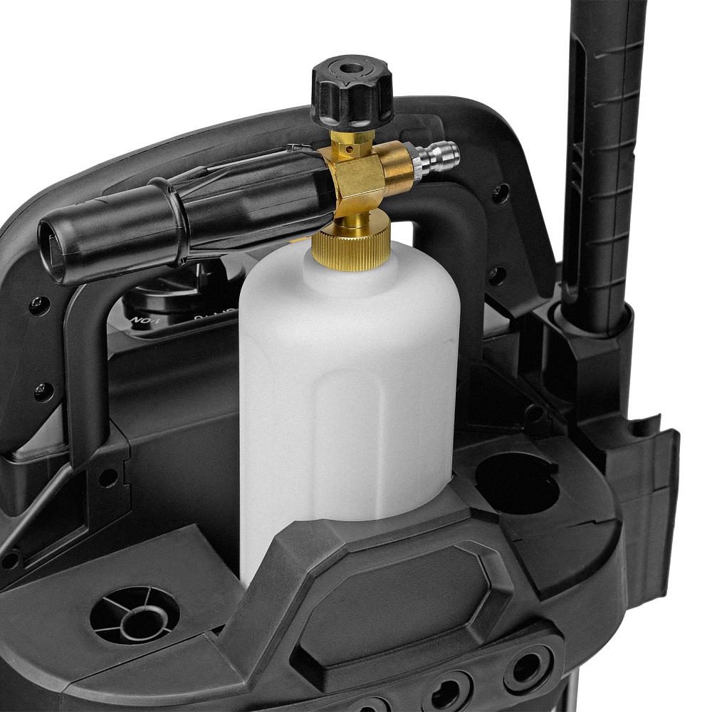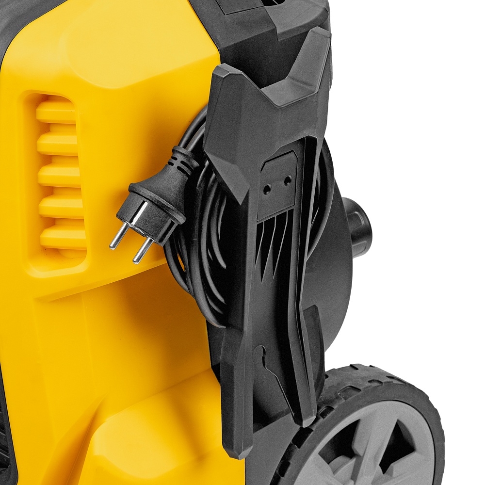 Мойка высокого давления, Барабан для шланга (установлен), Шланг высокого давления (установлен), Пистолет, Удлинитель пистолета, Сменные сопла 3 шт, Пеногенератор с бачком для моющего средства, Входной штуцер с фильтром, Быстросъемный коннектор шланга, кронштейн-держатель пистолета, Кронштей сетевого кабеля, Игла для прочистки сопла, Инструкция с гарантийным талоном