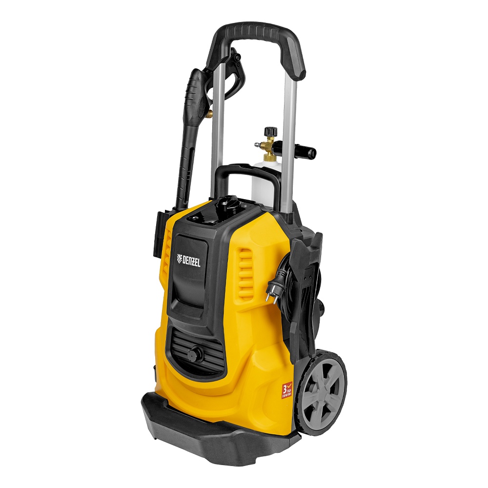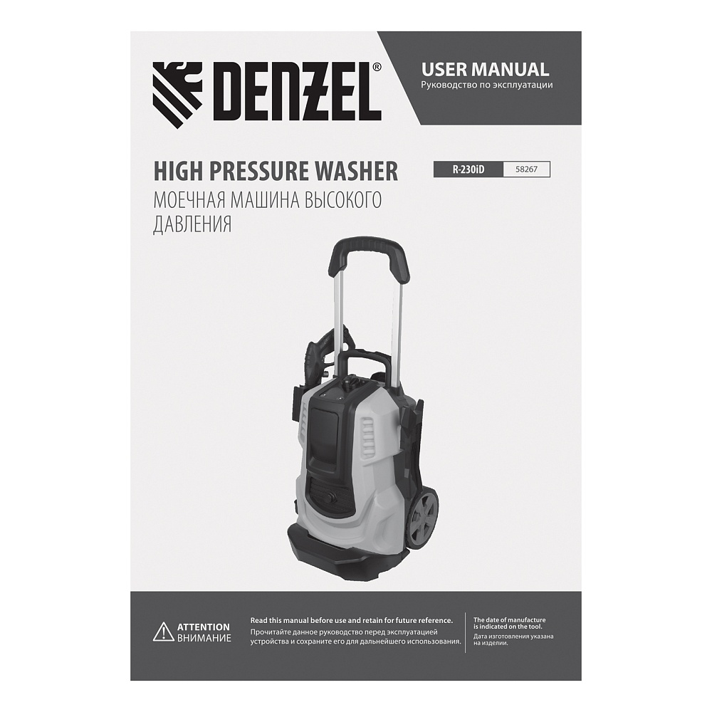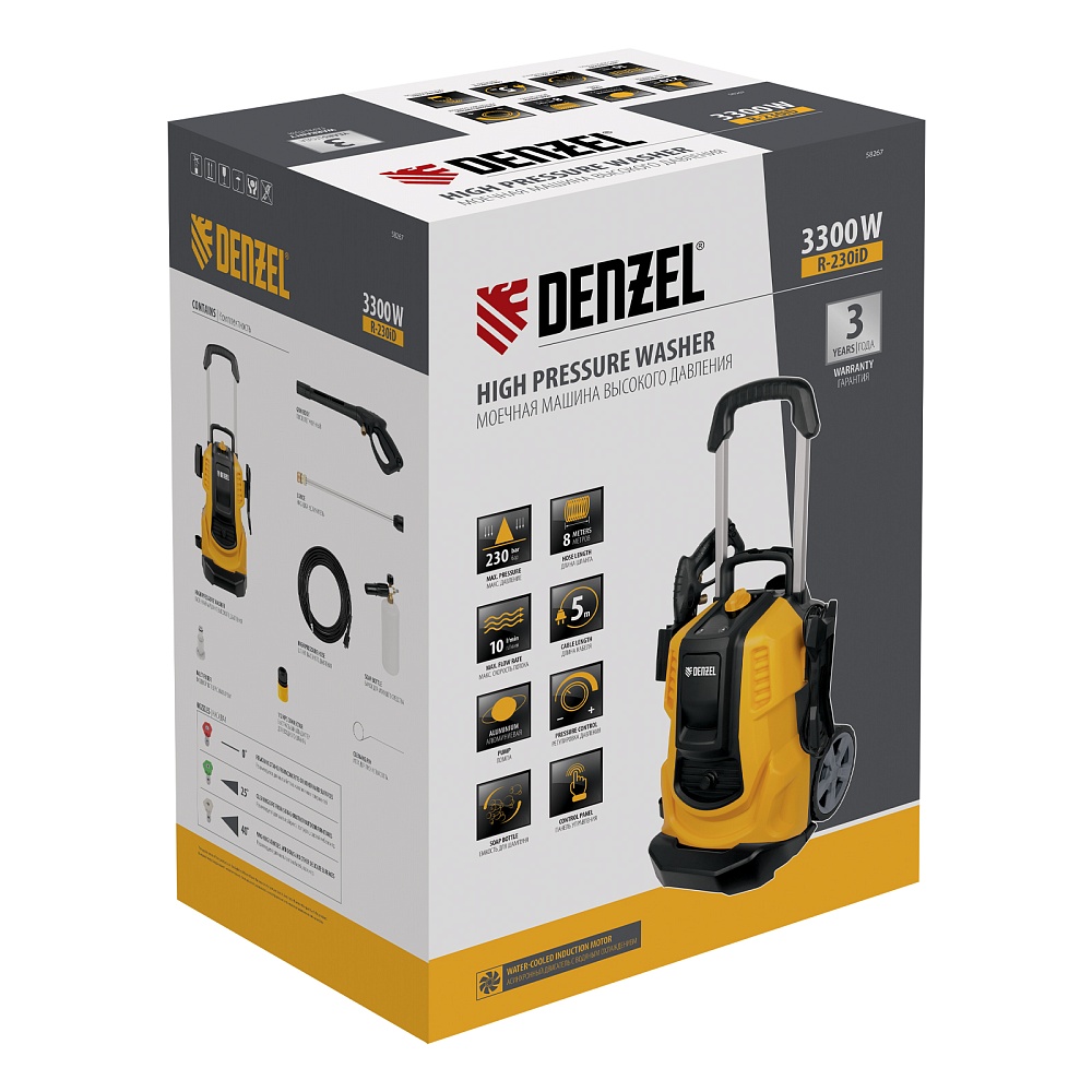 <p>Моечная машина высокого давления Denzel R-230iD 58267 с асинхронным двигателем мощностью 3300 Вт и барабаном для шланга предназначена для очищения поверхностей струей воды под давлением. Подходит для мытья дорожек, фасадов, автомобилей, садовых принадлежностей и т.д. Асинхронный двигатель устойчив к нагрузкам и выдерживает длительное интенсивное использование, а также не требует сложного обслуживания. Расход воды составляет 600 л/ч. Мойка способна работать в режиме самовсасывания и забирать воду из любого резервуара при отсутствии доступа к водопроводу. Машина рекомендована для применения в быту.</p><h2>Преимущества</h2><ul><li>Надежность — алюминиевая помпа со стальными плунжерами обеспечивает стабильное давление даже при длительной активной эксплуатации.</li><li>Эффективное решение поставленных задач — 3 форсунки позволяют осуществлять распыление под углом 0, 25 и 40°.</li><li>Удаление сильных загрязнений — в комплект поставки входит пеногенератор с улучшенной функцией пенообразования, латунным корпусом и увеличенным бачком для моющего средства объемом 1000 мл.</li><li>Простая подготовка к работе — удлинитель пистолета с быстросъемным креплением позволяет легко изменить угол распыла, установив нужную форсунку, или перейти к использованию пеногенератора.</li><li>Защита от засорения — фильтр воды для входного штуцера продлевает срок службы помпы.</li><li>Простой уход — машина поставляется с иглой для прочистки форсунок.</li><li>Продуманная конструкция — функциональный барабан для хранения шланга позволяет наматывать шланг без его отключения от мойки.</li><li>Защита от непредвиденного запуска — производитель предусмотрел блокировку рычага моечного пистолета.</li><li>Удобное управление — можно установить оптимальную величину давления при помощи кнопок и LED-дисплея.</li><li>Контроль давления — манометрический выключатель останавливает насос при отпущенном рычаге пистолета, перепускной клапан предотвращает превышение допустимого рабочего давления.</li><li>Термозащита — при перегреве двигатель отключается, что предотвращает выход моечной машины из строя.</li><li>Увеличенная рабочая зона — длина шланга высокого давления составляет 8 м, кабеля — 5 м.</li><li>Продуманное хранение насадок — они крепятся на корпус, поэтому всегда будут под рукой и не потеряются.</li><li>Комфортное перемещение — предусмотрены транспортировочная ручка, выдвижная рукоятка и колеса.</li><li>Гарантия 3 года — высокое качество техники подтверждено производителем.</li></ul>