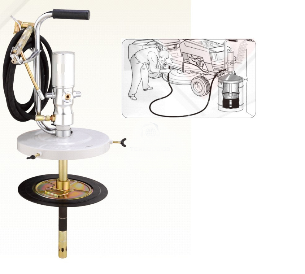 Нагнетатель пневматический, для густой смазки. Комплект оснащен тележкой для бочек 20-60 кг., пневматический насос для смазки 50:1 производительностью 800гр/мин, мембрана и крышка для солидолонагнетателя, шланг 4 м, раздаточный пистолет с наконечником. Колёса: 2 прямых. Масса: 16 кг.