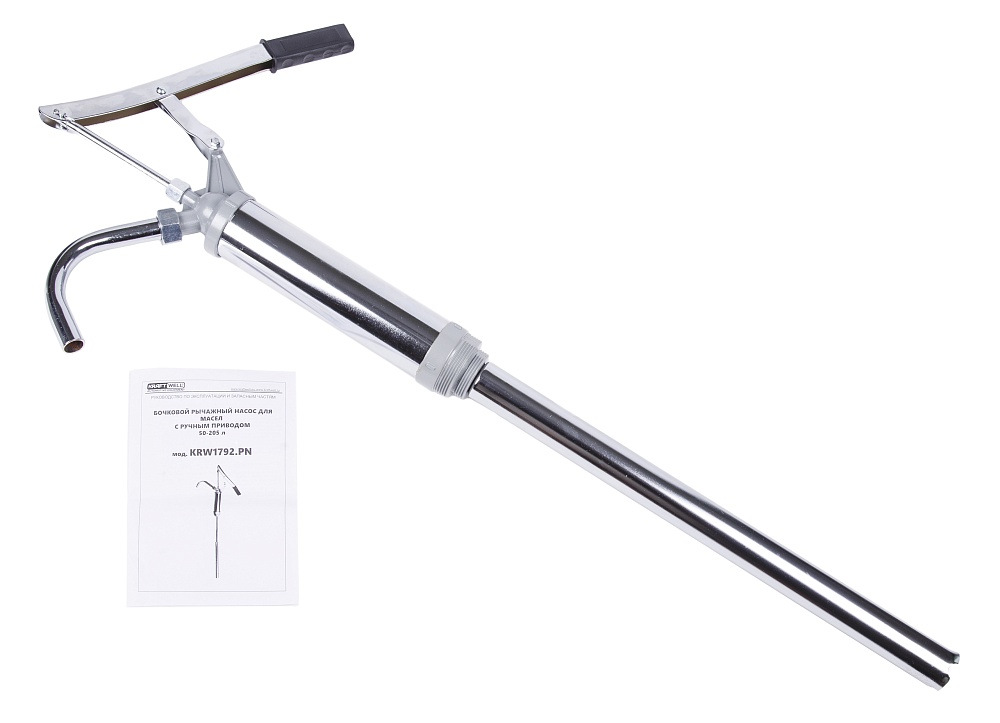 Ручной насос KRW1792.PN предназначен для перекачки моторных масел, дизельного топлива, керосина, а также гидравлических масел из бочек объемом 50-60 литров и 180-220 литров в емкости меньшего объема. Насос оснащен рукояткой рычажного типа, обеспечивающей скорость перекачки до 20 литров в минуту, в зависимости от вида перекачиваемой жидкости. Уплотнения насоса изготовлены из высококачественной резины типа NBR. Приемный патрубок имеет регулируемую высоту для точного подбора глубины погружения в бочку. Диаметр приемного патрубка составляет 35мм. Диаметр выходного «носика» составляет 19мм. Общая длина насоса - 1380 мм.