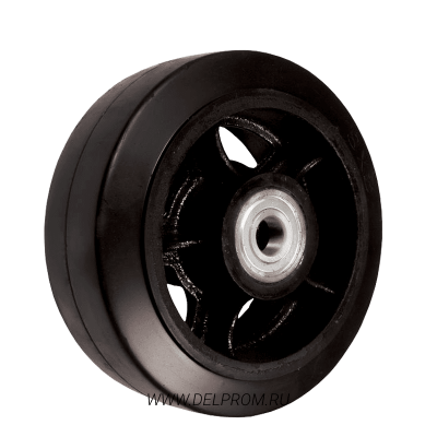 Роликовый подшипник в оси колеса. Чугунный обод. Контактный слой - жёсткая литая резина.