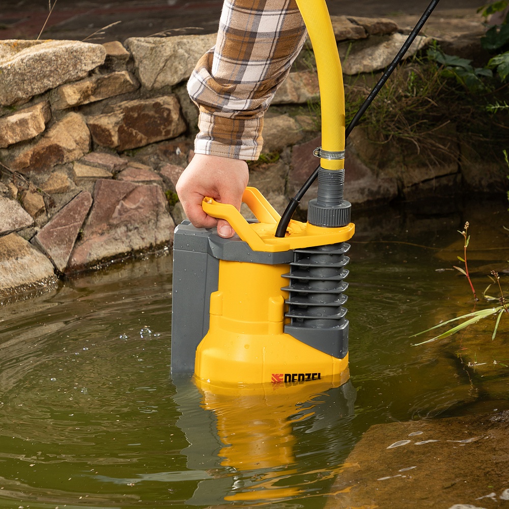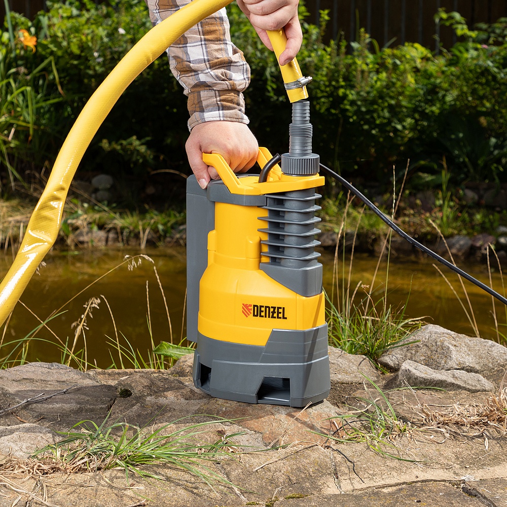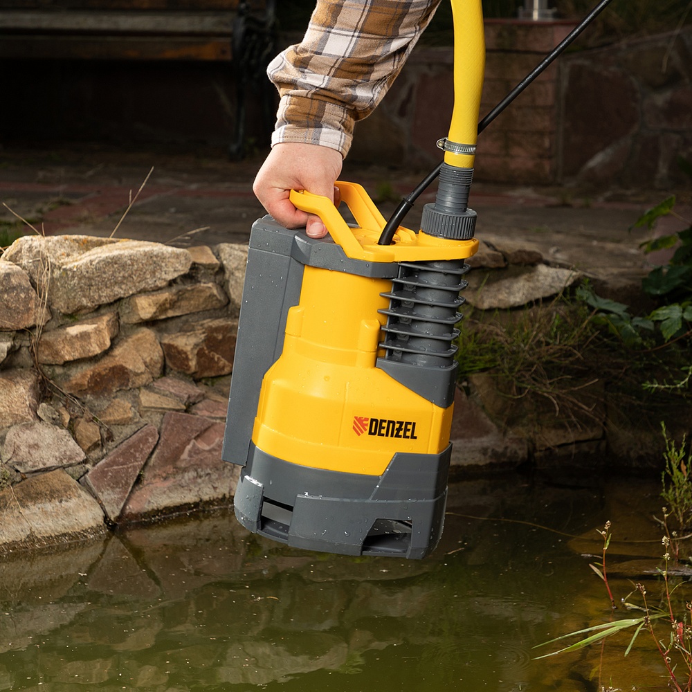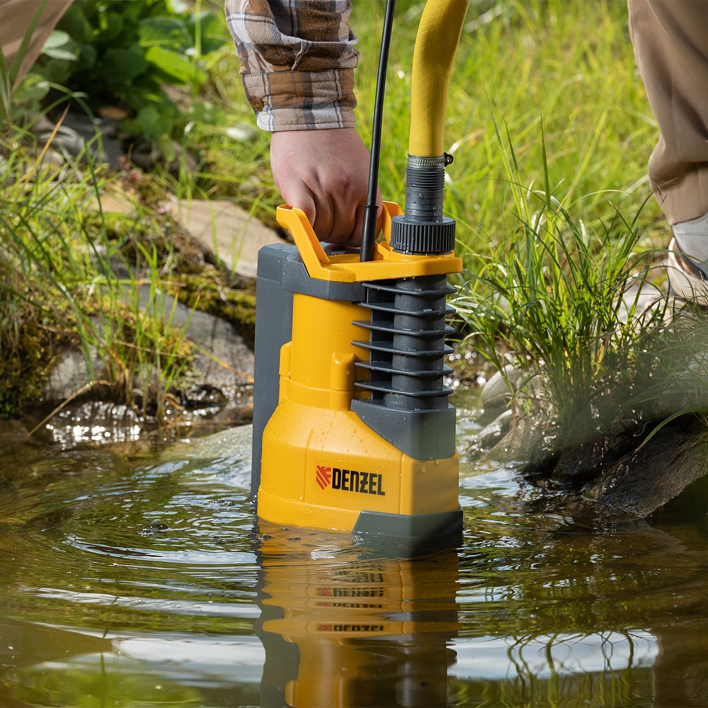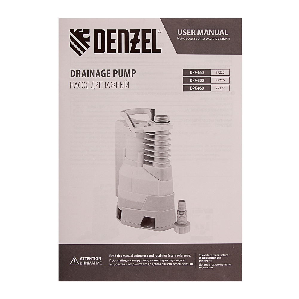 <p>Дренажный насос Denzel DPX650 97225 применяется для откачивания сточных вод из канав и затопленных подвальных помещений, перекачивания жидкостей с твердыми и сбитыми в комки мягкими фракциями диаметром до 35 мм. Также может использоваться на дачных участках для орошения растений, подачи пресной воды из колодцев, открытых водоемов и других источников. Двигатель мощностью 650 Вт обеспечивает скорость работы 191 л/мин и подъем на высоту 7 м, что позволяет добиться эффективного перекачивания жидкости. Максимальная высота погружения составляет 7 метров.</p><h2>Преимущества</h2><ul><li>Защита от работы на сухом ходу — поплавковый механизм позволяет предотвратить поломку двигателя при понижении воды ниже допустимого уровня.</li><li>Автоматический и ручной режимы работы — насос можно настроить для включения при определенном уровне воды или использовать для осушения помещений или резервуаров до остаточного уровня 45 мм.</li><li>Простая установка — насос без лишних усилий опускается с помощью троса в вертикальном положении на глубину до 7 м.</li><li>Высокий ресурс — корпус из прочного пластика, вал из нержавеющей стали и торцевое уплотнение из карбида кремния обеспечивают долговечность и надежность устройства.</li><li>Быстрая подготовка к работе — универсальный патрубок 1/4 дюйма и 1 дюйм позволяет подключать шланг без переходника.</li><li>Оптимальная длина сетевого шнура 10 м — устройство удобно подключать, также длинный кабель позволяет избежать попадания воды на переходник и предотвратить пользователя от удара током. </li><li>Степень защиты IPX8 — электронные компоненты надежно изолированы от воды, поэтому насос выдерживает длительное погружение в воду. </li><li>Компактность — благодаря небольшому размеру и весу 5,1 кг насос удобно погружать даже в узкие колодцы.</li><li>Удобная транспортировка — в верхней части корпуса предусмотрена эргономичная ручка.</li><li>Гарантия 3 года — высокое качество насоса подтверждено производителем.</li></ul>
