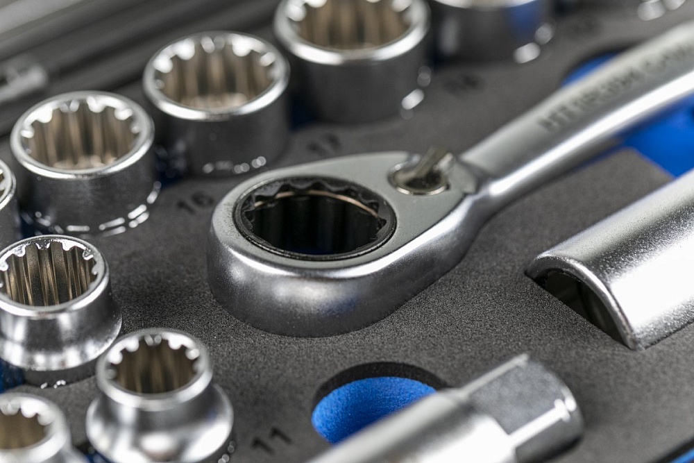 Набор сквозных торцевых головок и аксессуаров. Все торцевые головки были кованы по стандарту, а это означает, что по периметру имеют 12 клиньев. Это специальная форма позволяет подобрать головки к шестигранным, двенадцатигранным болтам и гайкам, torx, spline, квадратным и дюймовым размерам. Трещотка, торцевые головки и аксессуары являются сквозными и обеспечивают работу на длинных штырях (амортизаторы).