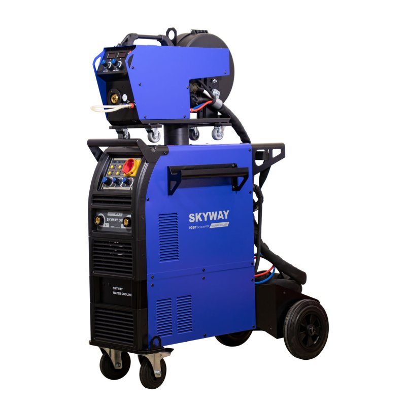 SKYWAY 500 – 3-х фазный инвертор для полуавтоматической сварки в среде инертного/активного защитного газа MIG-MAG и ручной дуговой сварки штучным электродом MMA, - как с источника так и с выносного подающего механизма. Тележка с подставкой под баллон, высокая компоновка аппарата, встроенная станция охлаждения, подающий механизм "декомпакт" в базовом комплекте поставки - все эти моменты существенно облегчают работу сварщика и значительно увеличивают время непрерывной работы аппарата. SKYWAY – это передовая технология инверторного блока IGBT, отличные сварочные характеристики и превосходная эргономика управления.