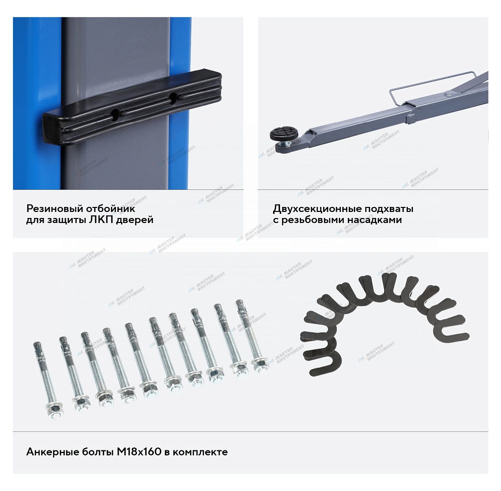 Регулируемые опоры и подхваты — точная установка под разные точки подъёма автомобиля;