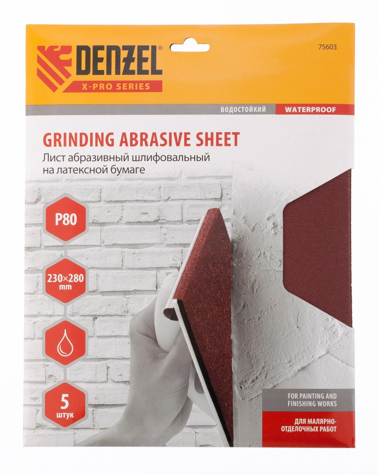 Шлифлист на бумажной основе, P 80, 230 х 280 мм, 5 шт, латексный, водостойкий Denzel