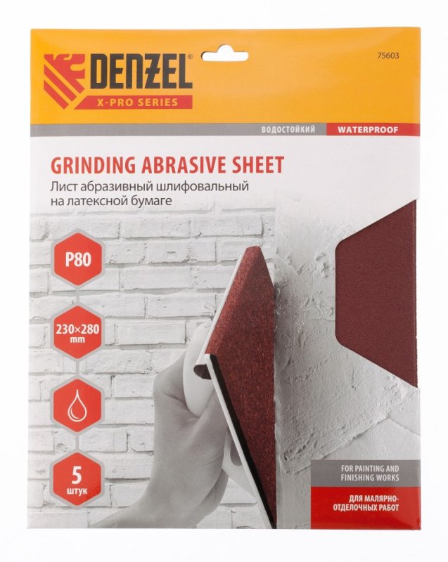 <p>Шлифлист на бумажной основе Denzel Р80 арт. 75603 применяется для выравнивания шпатлеванных и оштукатуренных поверхностей на основе гипсовых и известковых составов, а также для обработки дерева, металла, пластика, удаления ржавчины, загрязнений, заусенцев, старых лакокрасочных покрытий.,Абразив Р80 с зернами 200-250  мкм легко справится с промежуточной обработкой поверхностей.</p><h2>Преимущества</h2><ul><li>Высокая скорость работы — зерно оксида алюминия 1-го класса имеет острые грани и легко справляется с обработкой различных материалов.</li><li>Бумажно-латексная основа — устойчива к растяжению и высоким нагрузкам, имеет гибкую структуру и высокую износостойкость.</li><li>Водостойкий — шлифлист можно использовать для мокрого шлифования и очищать рабочую часть, промывая ее в воде.</li><li>Удобная упаковка по 5 шт.</li><li>Универсальность использования — устанавливается на вибрационную шлифмашину (плоскошлифовальную), а также в различные приспособления для шлифования соответствующего типоразмера, либо используется для ручной обработки.</li></ul>