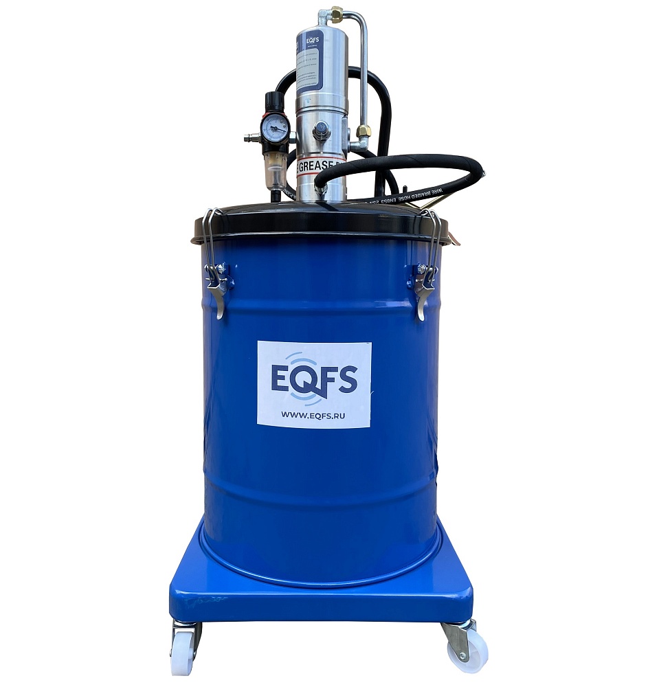 Корпус нагнетателя смазки – стальной, насос изготовлен из анодированной стали. Фиксация насоса с крышкой к баку для смазки производится с помощью металлических защелок с резьбой. Для удобства транспортировки нагнетатель оборудован металлической ручкой в верхней части корпуса. Нагнетатель оборудован маслобензостойким армированным шлангом длиной 4 м. Солидолонагнетатель для консистентной смазки, установленный на колесах, имеет легкий вес и экономичную конструкцию для удобства перемещения и эксплуатации.