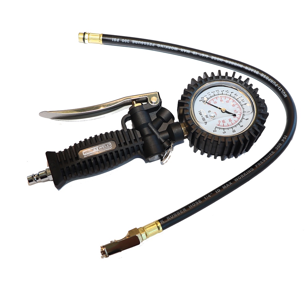 KRWTG-A4 KraftWell Пистолет для подкачки шин. В цветной коробке. Аналоговый жидкостный манометр. Пластиковая рукоятка, металлический курок. Давление до 12 бар.