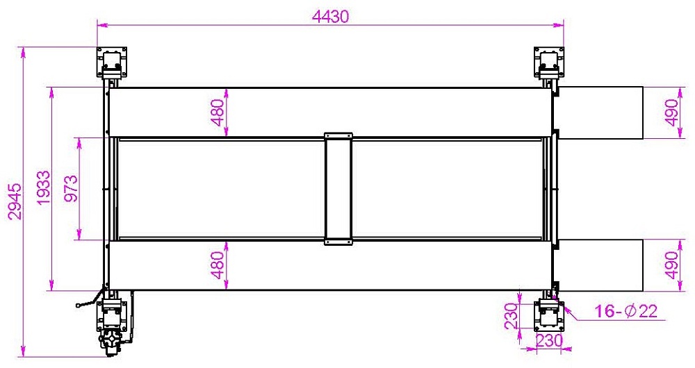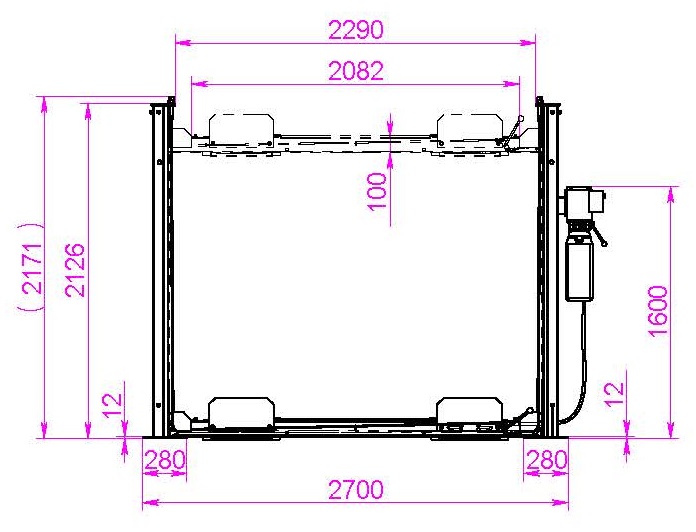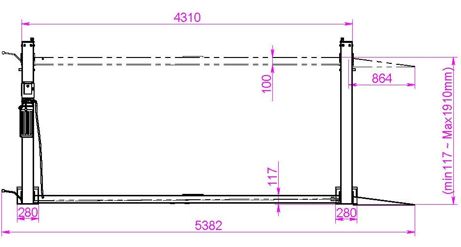 Подъемник четырехстоечный, электрогидравлический, г/п 5500 кг., 3 кВт, высота подъема 1900 мм., размеры платформ 5700х508 мм, платформы - комплектация для поста сх-развала.