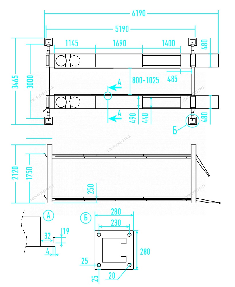 Подъемник четырехстоечный 5 т, без траверсы, для сход-развала, механическое снятие, синий NORDBERG 4450_MB купить в Волгограде цена ✅ - Все для СТО