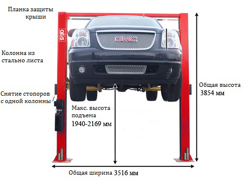 Двухстоечный электрогидравлический подъемник с верхней синхронизацией, грузоподъемность 4.5 т, высота колонны 3854мм, механическое управление стопорами на одной колонне.