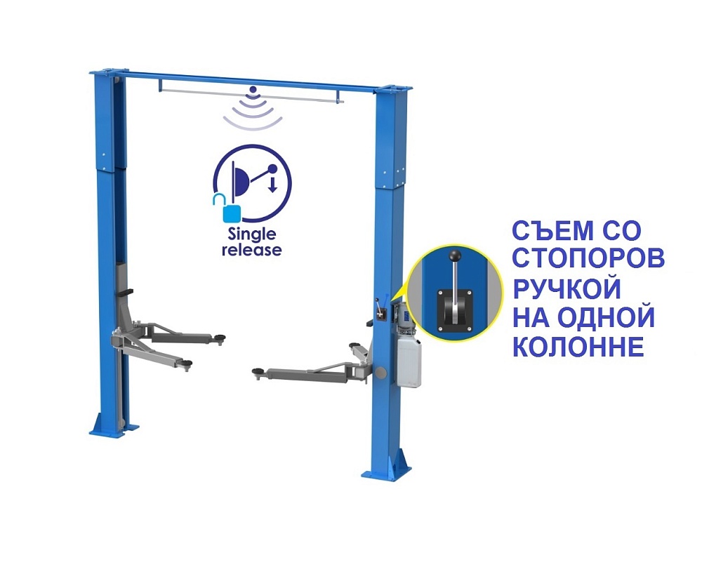 Электрогидравлический двухстоечный подъемник с нижней синхронизацией Снятие со стопоров каретки с одной колонны Усиленная конструкция каретки и колонн Трехсекционные подхваты для обслуживания всех видов легкового транспорта