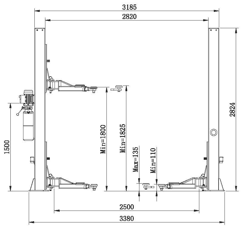 Высота подъёма 1825 мм, высота подъемника 2824 мм, общая ширина подъемника 3380 мм, расстояние между стойками 2820 мм.