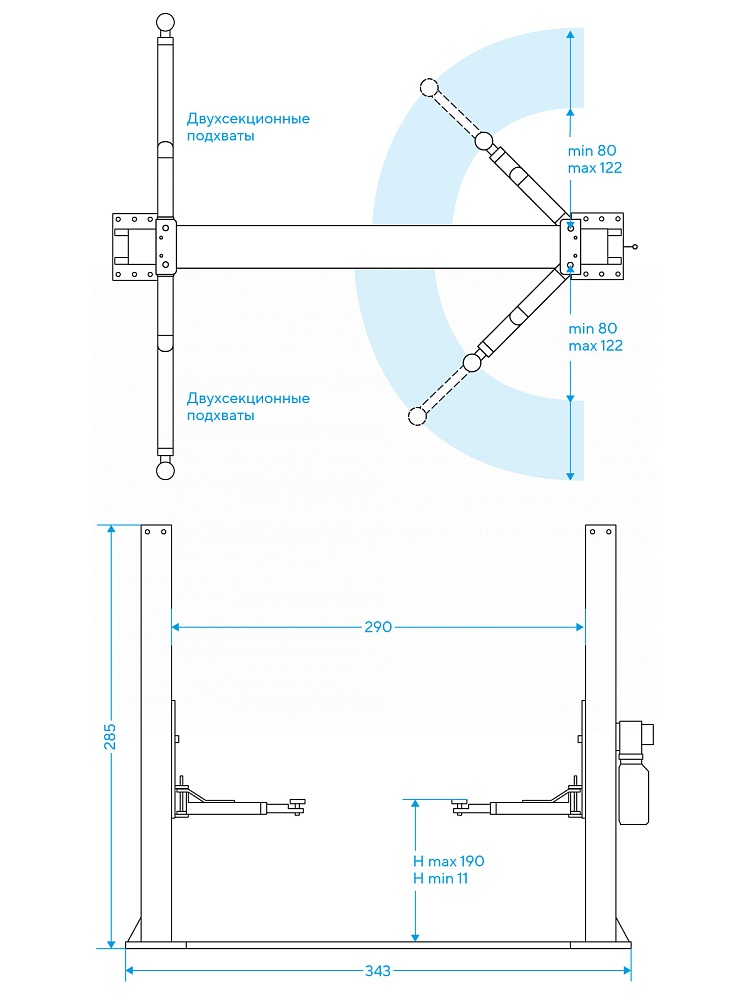 Рассчитан на обслуживание легковых автомобилей. Надёжная конструкция, симметричная схема подъёма и нижняя синхронизация обеспечивают стабильную и безопасную работу.