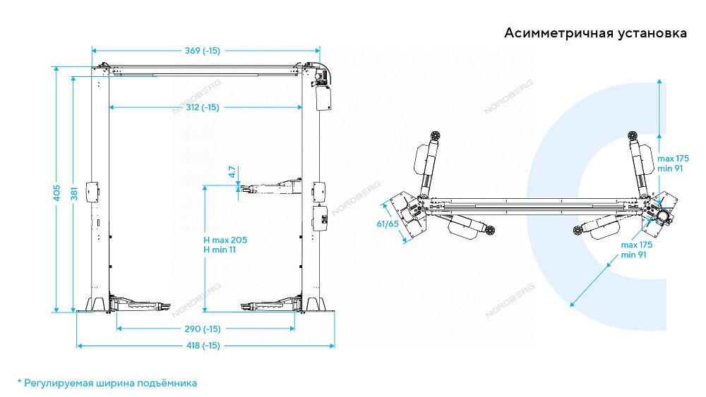 NORDBERG N4125H-4,5G — двухстоечный подъемник с верхней синхронизацией. Обеспечивает надежную фиксацию транспортного средства и равномерное распределение нагрузки.