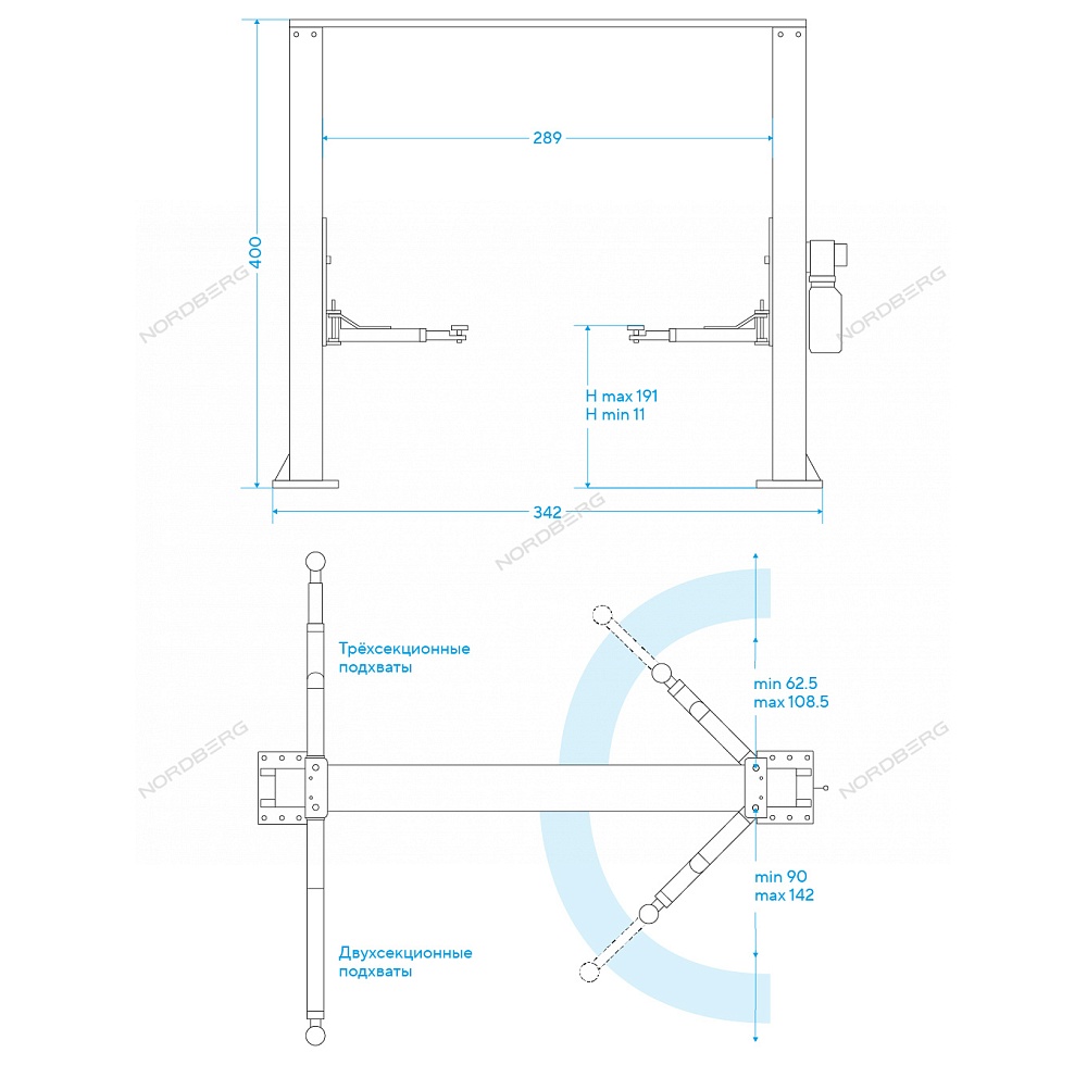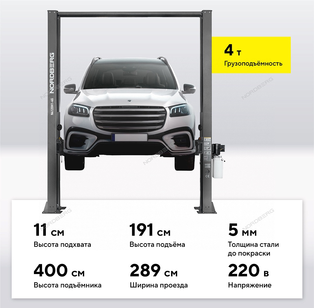 Подъемник двухстоечный 4 т, верхняя синхронизация, H=4 м, 220 В, серый NORDBERG N4120H1-4G_3+2_220 купить в Волгограде цена ✅ - Все для СТО