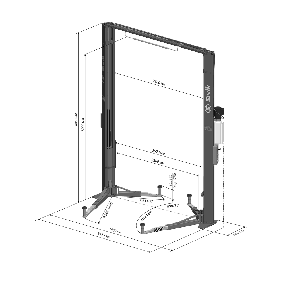 Электрогидравлический двухстоечный подъемник с нижней связью для легковых автомобилей и внедорожников общей массой до 4,1 т. Классическая симметричная конструкция с двухсоставными подхватами низкого профиля позволяет обслуживать машины с низким клиренсом. Подходит для СТО с невысокими потолками