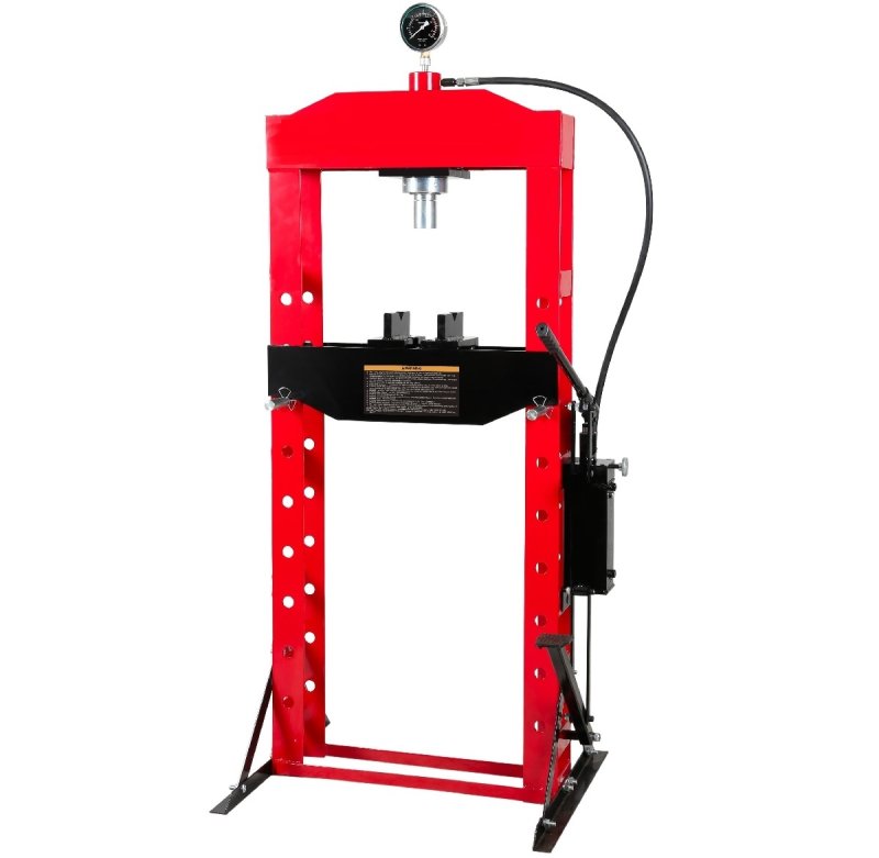 Пресс напольный, полностью сварная рама, усилие 20 тонн, управление ручное/ножное, гидроцилиндр с пуансоном перемещается по всей ширине каретки, клапан защиты от перегрузки, манометр.