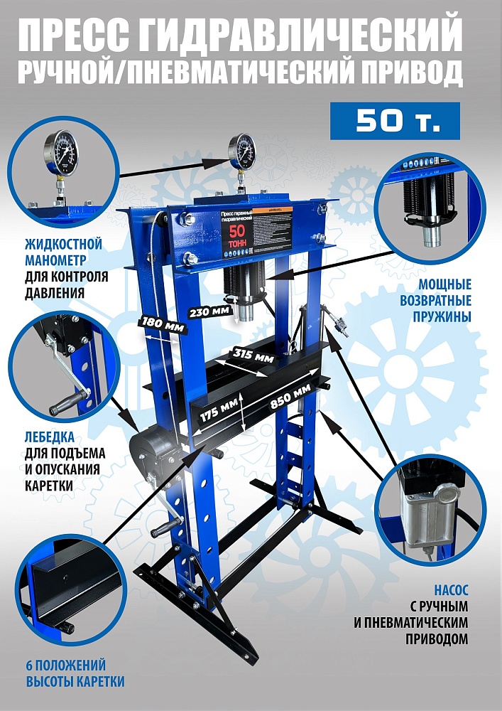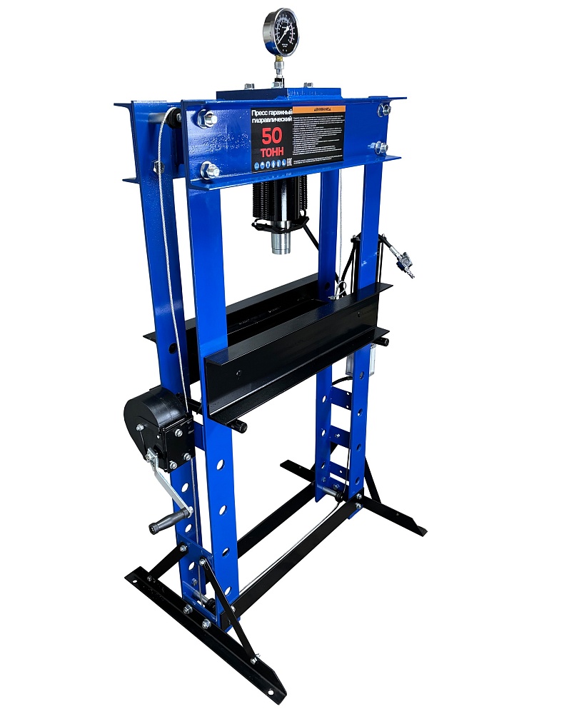 Пресс гидравлический 50 тонн, для автосервиса. Ход поршня 0-230 мм. Рабочее окно 650х860 мм. Управление ручное/пневматическое, манометр, ручная лебедка. Рекомендуется для выпрессовки подшипников, деталей машин, втулок и т.п. в автосервисе, Гараже и СТО. Цвет синий. Доставка по РФ и ТС. Подъёмная площадка регулируется по высоте и фиксируется в требуемом положении