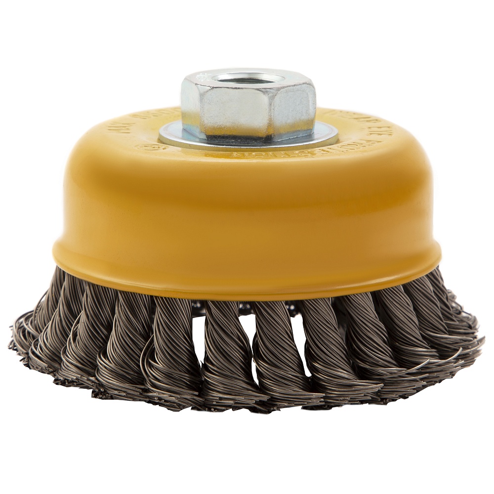 <p>Щетка для УШМ «Чашка» Denzel 746283, М14, диаметром 100 мм, с щетиной из крученой нержавеющей проволоки диаметром 0,5 мм, предназначена для грубой очистки твердых поверхностей от ржавчины, лакокрасочных покрытий, загрязнений, удаления заусенцев, а также для зачистки сварных швов. Снимает толстый слой материала, идеально подходит для обработки изделий из нержавеющей стали. Щетка имеет форму чашки и позволяет очищать участки большой площади. Оснастку устанавливают на вал углошлифовальной машины. Рекомендуемая максимальная скорость вращения составляет 8500 об/мин. Во время работы следует использовать средства индивидуальной защиты — очки, респиратор, наушники, перчатки, а также специальную одежду и обувь. Щетка применяется в строительстве, на производстве, а также в быту.</p><h2>Преимущества</h2><ul><li>Проволока толщиной 0,5 мм, скрученная в пучки, придает щетине устойчивость к повышенным нагрузкам.</li><li>Покрытый эмалью корпус и щетина из нержавеющей стали AISI 201 не ржавеют, поэтому щетку можно использовать в условиях сильной влажности.</li><li>Частицы проволоки из нержавейки, остающиеся на обрабатываемой поверхности, не вызывают ее коррозии.</li><li>Усиленный корпус и гайка обеспечивают повышенную прочность щетки.</li><li>Крепление на гайку М14 ускоряет установку и замену оснастки.</li><li>Строгий контроль качества на всех этапах производства подтверждает надежность щетки.</li></ul>