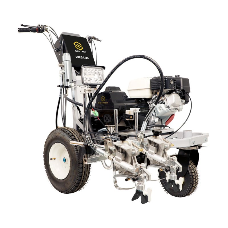 Schtaer Wega 35 - машина для распыления дорожной разметки краской. Разметочная машина с двумя краскопультоми предназначена для нанесения сплошных и прерывистых линий краской на дорогу, разметки пешеходников, нанесения дорожных знаков и надписей на дорогу, разметки парковок мест около магазинов и выставочных залов, разметки спортивных площадок и футбольных полей. Разметочную машину можно использовать только с краской, пригодной для безвоздушного распыления. Также машину можно использовать для разметки дорожных бордюров, мостовых конструкций, столбов фонарного освещения.