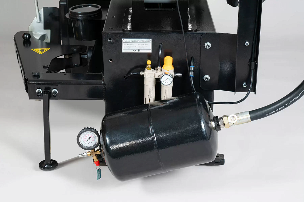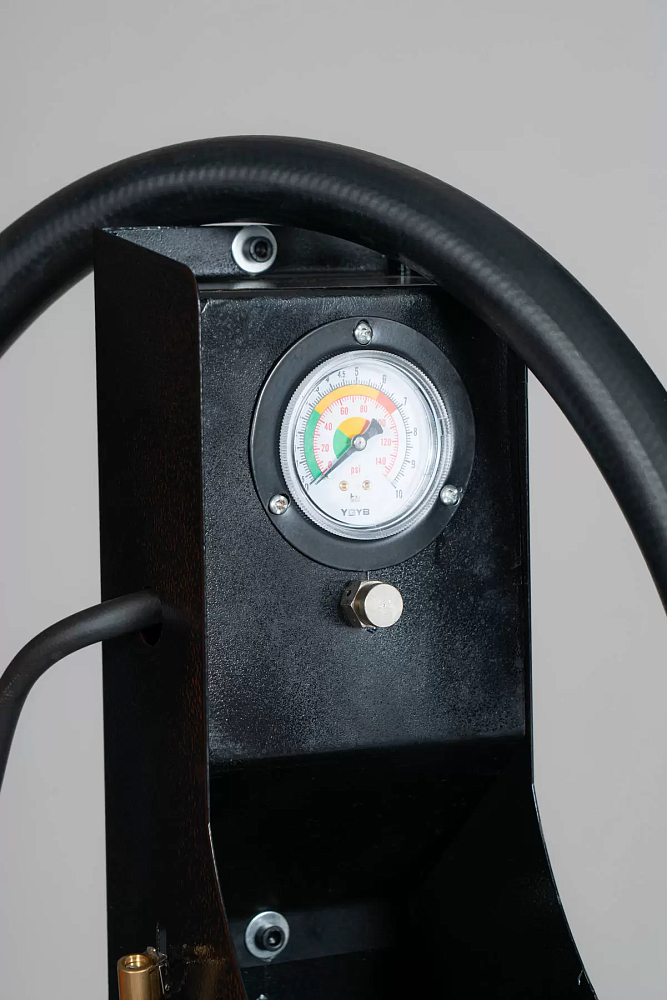 • Манометр контроля давления воздуха смонтирован на монтажной стойке. Накачка нажатием ногой на педаль.
