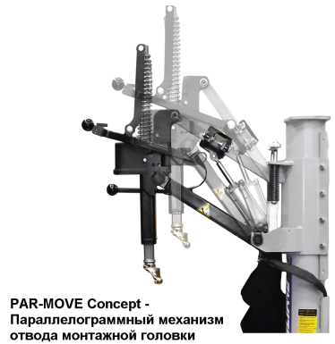 - Усиленный корпус Racing. Для большей жесткости конструкции кронштейн крепления монтажной колонны имеет массивные косынки. Параллелограммный механизм отвода монтажной головки с пневматической фиксацией не только экономит место в мастерской, но и обеспечивает исключительную жесткость узла. Данные решения обеспечивают абсолютную жесткость конструкции и минимальные изгибы ответственных рабочих элементов, снижая вероятность касания монтажной головки колесного диска.