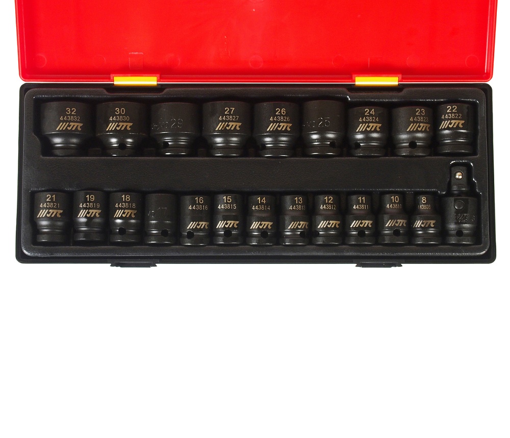 Артикулы JTC-43908-32: 6-гранные: 8, 10, 11, 12, 13, 14, 15, 16, 17, 18, 19, 21, 22, 23, 24, 25, 26, 27, 29, 30, 32 мм. - 21 шт.
