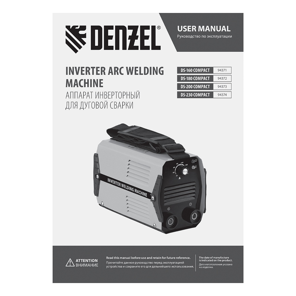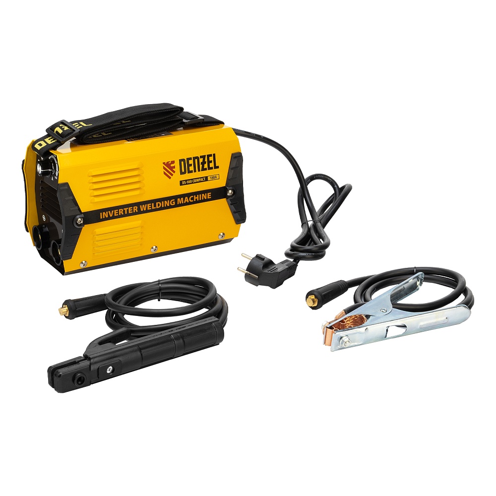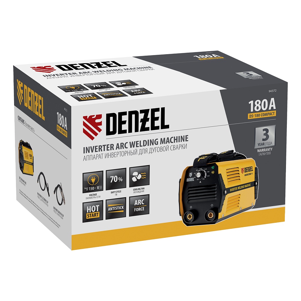 <p>Инверторный аппарат дуговой сварки Denzel DS-180 Compact 94372 с максимальной силой тока 180 А имеет продолжительность включения 70% и работает с электродами диаметром 1,6-4 мм. Используется для сварки стальных металлоконструкций, будет полезен в мастерской, гараже или на даче. Прост в эксплуатации и подойдет даже новичку. Аппарат способен работать даже при низком входном напряжении 150 В, имеет высокий показатель продолжительности включения 70% и быстро остывает, что повышает скорость и эффективность сварки.</p><h2>Преимущества</h2><ul><li>Плавная и точная настройка — при помощи поворотного регулятора можно менять величину сварочного тока для работы с электродами разного диаметра.</li><li>Быстрый старт — легкий поджиг (Hot Start) помогает зажечь дугу и повышает стабильность ее горения.</li><li>Высокое качество сварки — форсаж дуги (Arc Force) предупреждает ее обрыв в процессе работы.</li><li>Антизалипание электрода — функция Anti Stick позволяет легко отделить электрод от металла, не повредив обмазку.</li><li>Защита силовых компонентов (IGBT Shield) — аппарат автоматически отключается при перегрузке или коротком замыкании, предотвращая повреждение элементов платы.</li><li>Надежность — плата покрыта лаком, защищающим ее от пыли, а изоляционная пластина исключает возможность пробоя между радиатором и корпусом.</li><li>Устойчивость к внешним воздействиям — устройство имеет степень защиты IP21 и не боится проникновения капель воды и мелких предметов.</li><li>Улучшенное охлаждение — направляющая пластина обеспечивает эффективную вентиляцию, что способствует стабильному функционированию аппарата.</li><li>Качественный кабель питания — мягкий сетевой шнур длиной 1,5 м с долговечной PVC изоляцией сохраняет эксплуатационные характеристики даже на морозе.</li><li>Комфортная работа — изделие весит всего 3,4 кг и комплектуется плечевым ремнем, поэтому его удобно перемещать.</li><li>Подтвержденное качество — гарантия на заводской брак действует 3 года.</li></ul>