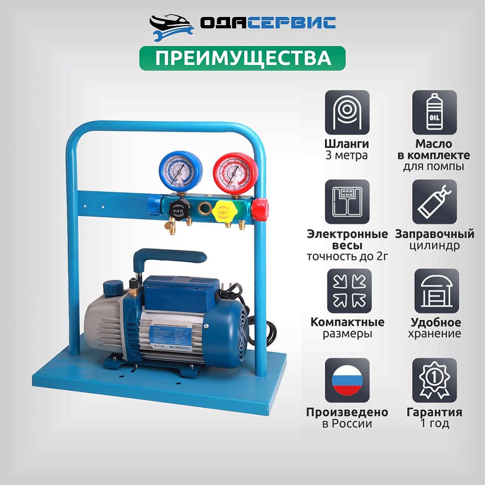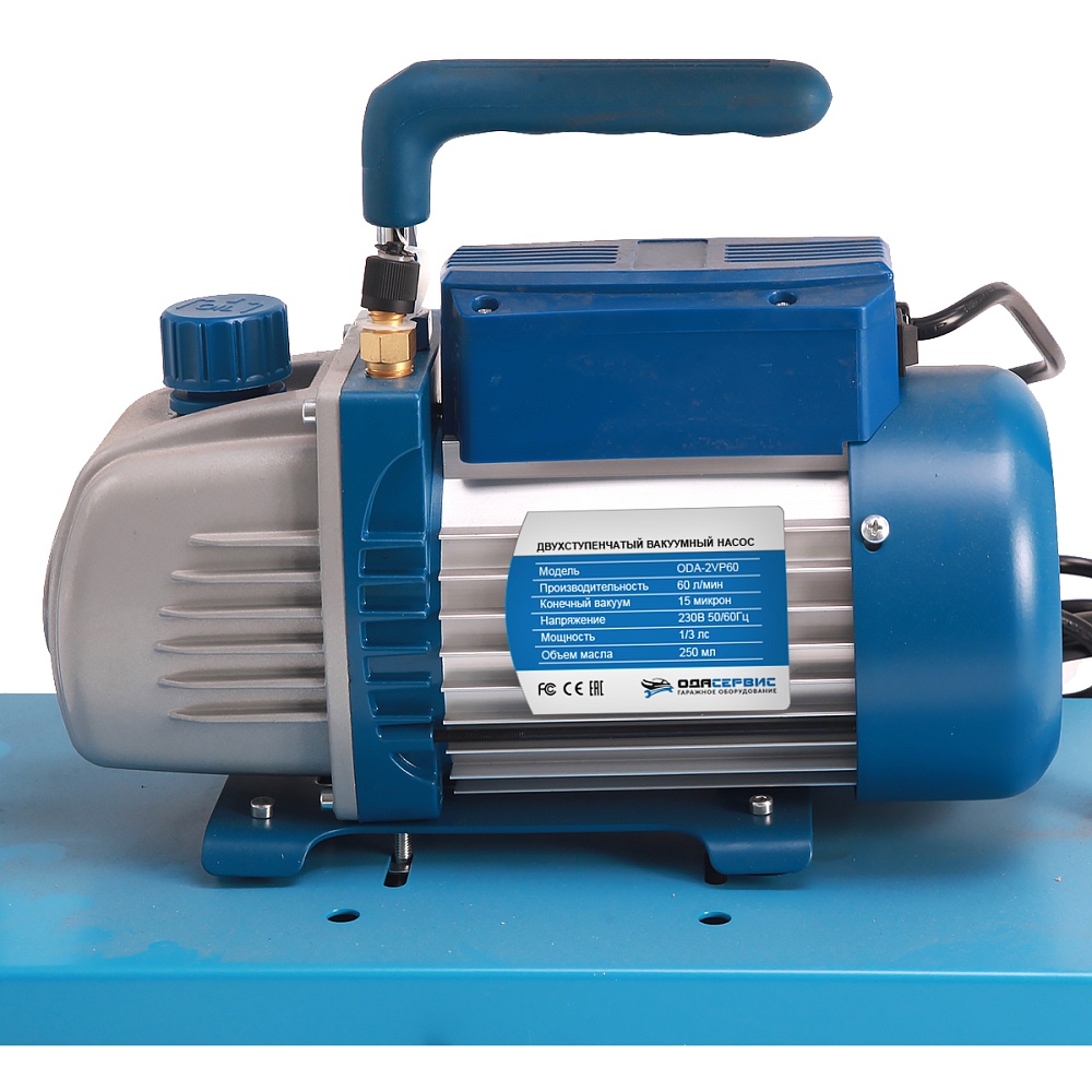 В зависимости от модели, установка комплектуется одноступенчатой или двухступенчатой вакуумной помпой с производительностью 60 л/мин. В комплект также входят 4 заправочных шланга различной длины ( 3м - 2шт., 1,5м - 1шт., 0.5м - 1 шт.). Для удобства транспортировки и хранения все компоненты установки установлены на металлической раме.